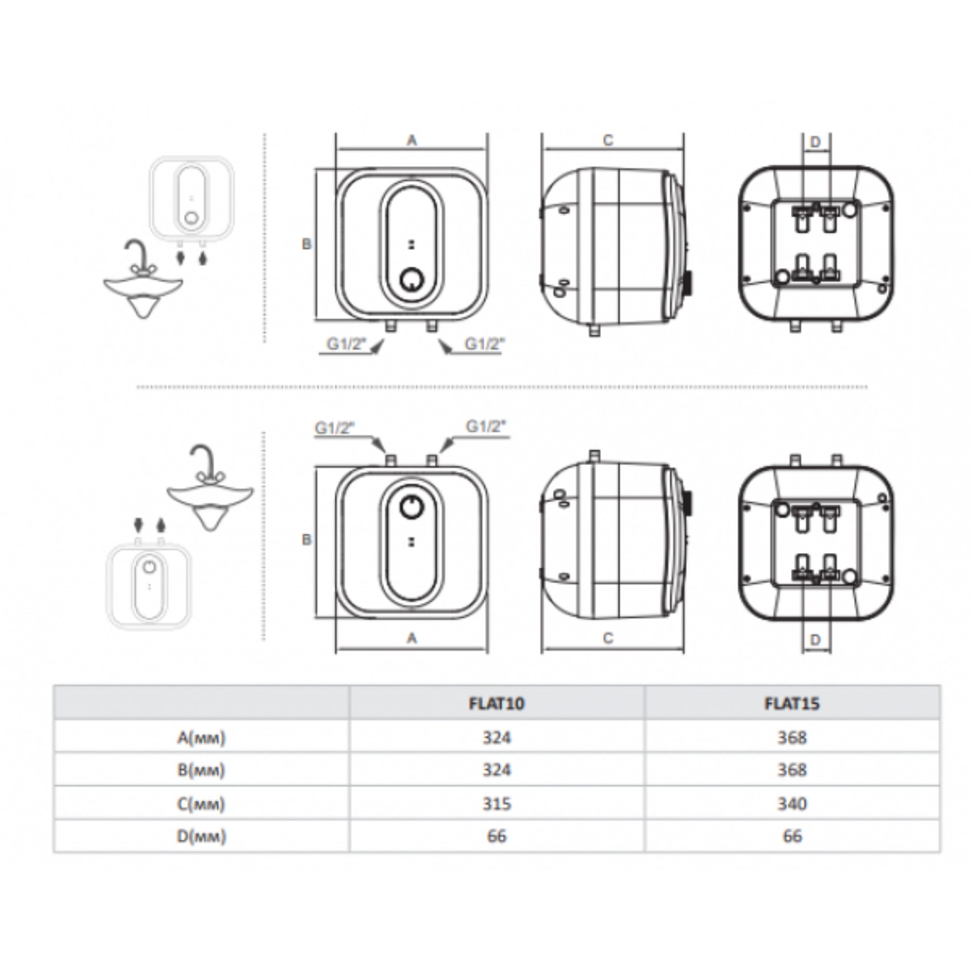 Бойлер Hi-Therm FLAT10 U 10 л 2 кВт мокрый ТЭН, под мойку, белый
