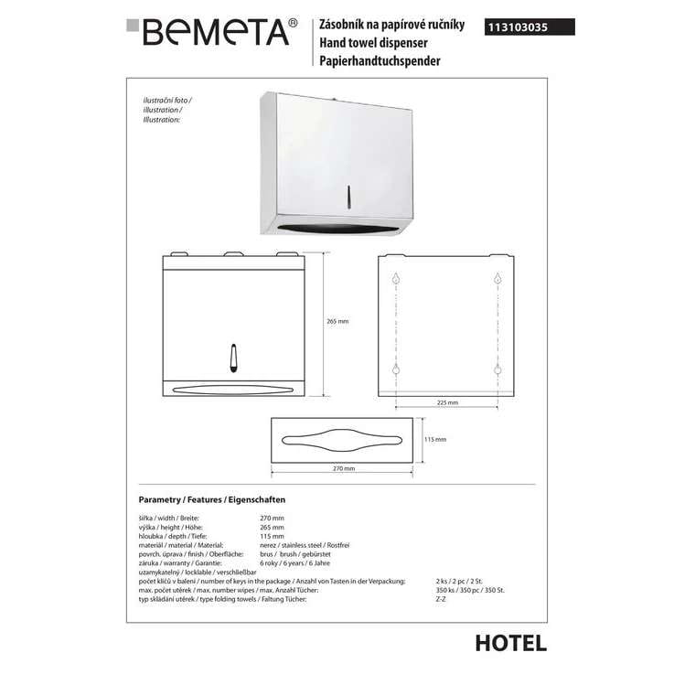 Диспенсер для бумажных полотенец Bemeta Hotel нержавеющая сталь, сталь (113103035)