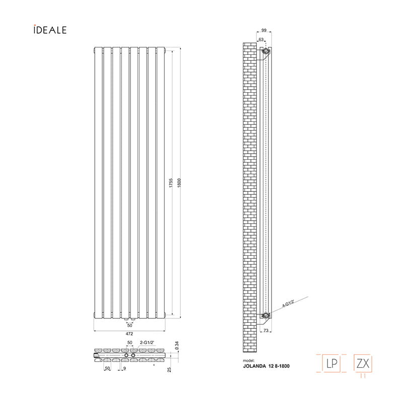 Дизайнерский радиатор IDEALE Jolanda 12 1800×472 вертикальный, антрацит матовый (универсальное подключение)