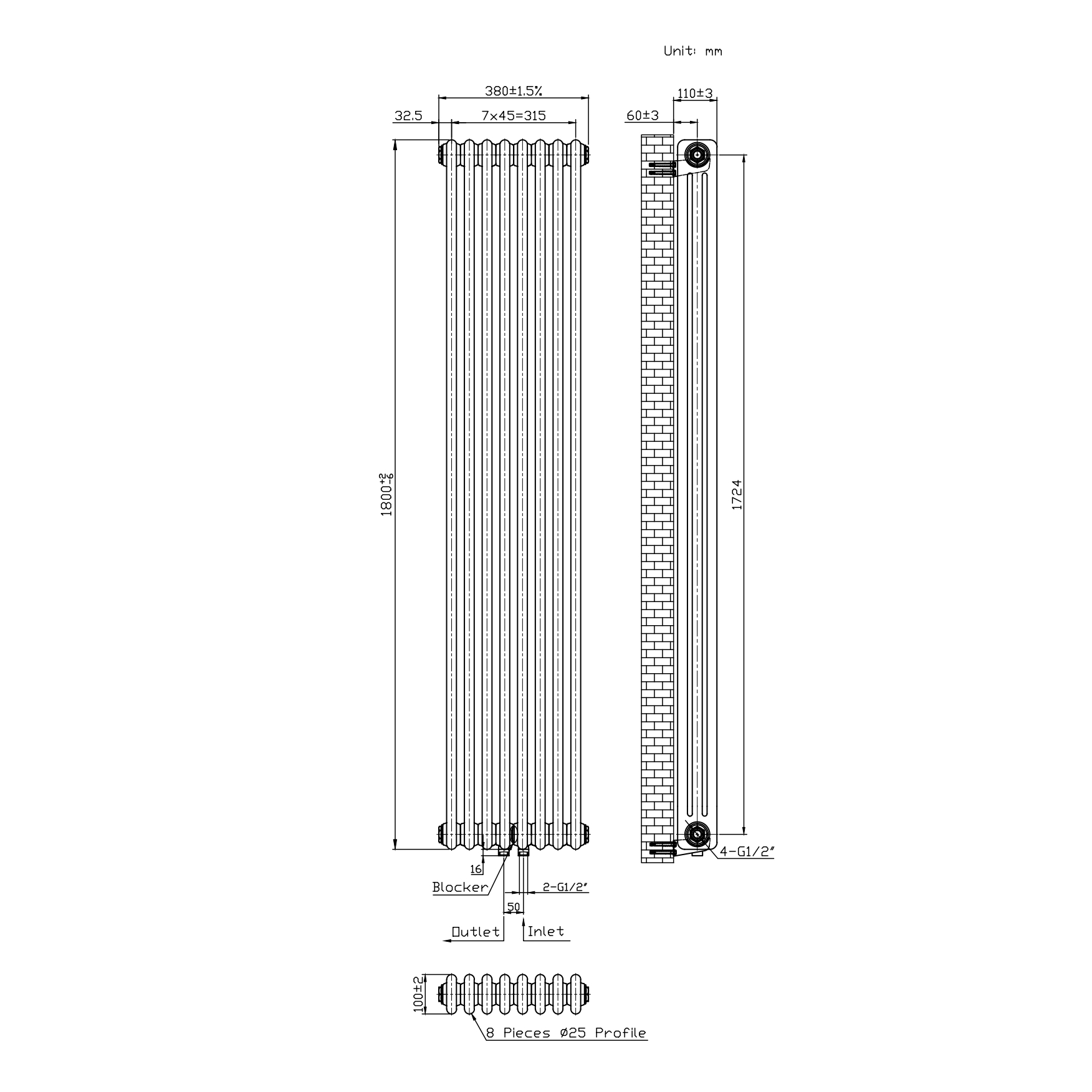 Дизайнерский радиатор Warm Well Column 3 1800×380 вертикальный, черный матовый