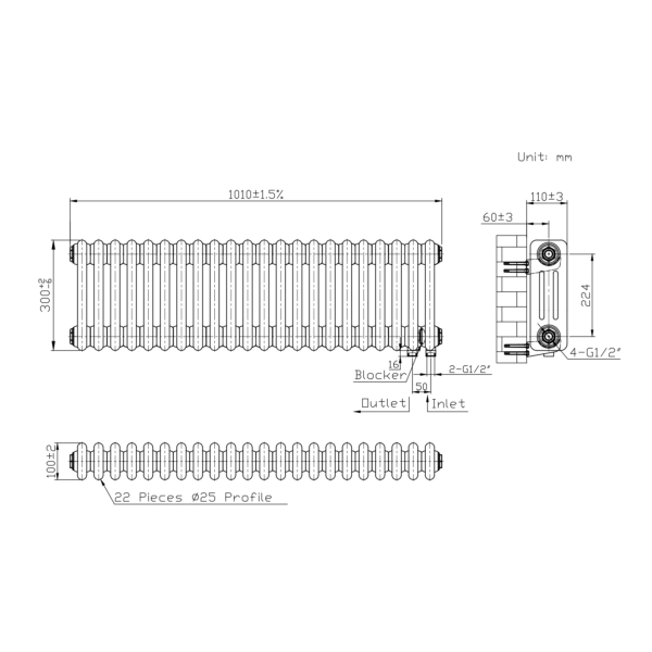 Дизайнерский радиатор Warm Well Column 3 300х1010 горизонтальный, черный матовый