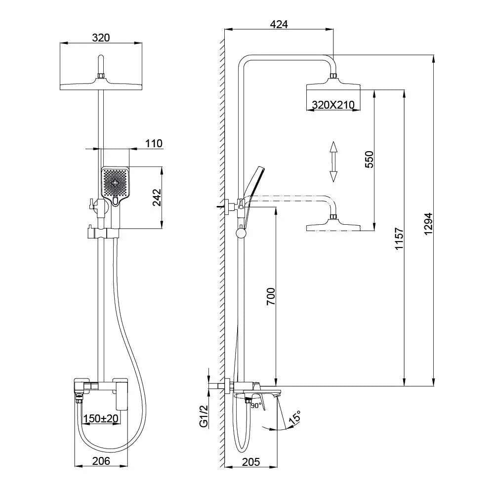 | Длина кронштейна для верхнего душа, мм | 424 |