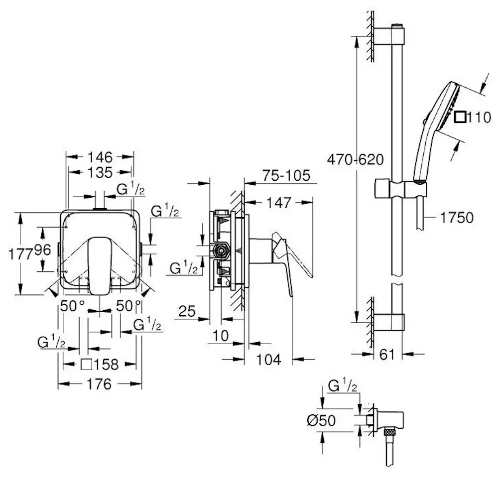 | Комплектация | Смеситель скрытого монтажа, Держатель для ручной лейки, Душевая стойка, Душевой шланг, Крепление для монтажа, Ручная лейка |