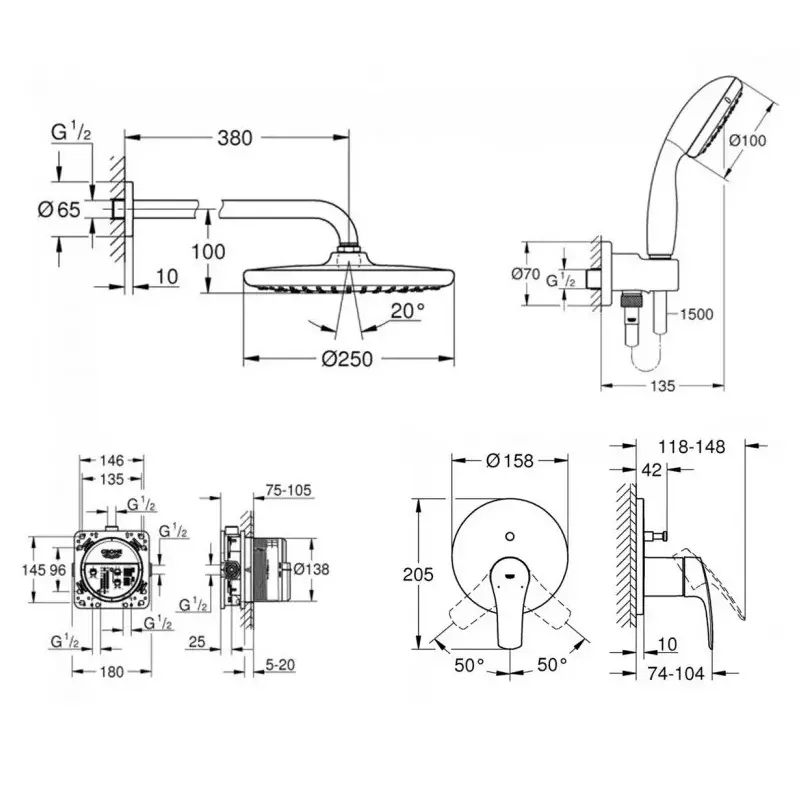 | Комплектация | Верхний душ, Держатель для ручной лейки, Душевой шланг, Крепление для монтажа, Кронштейн для верхнего душа, Ручная лейка |