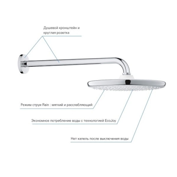 | Фирменные технологии | GROHE DreamSpray® — равномерное распределение воды по форсункам для комфортного потока., GROHE DripStop после закрытия подачи воды не капает ручной душ, GROHE EcoJoy – позволяет экономить до 50 % воды, GROHE Inner WaterGuide – предотвращает нагрев её поверхности., GROHE Longlife® — долговечный картридж для плавной регулировки воды., GROHE QuickFix – система быстрого монтажа, Grohe ShockProof – защищает душевую головку и поддон для душа при падении лейки., GROHE SilkMove® — плавное управление температурой и напором., GROHE SpeedClean – предотвращает образование известковых отложений на душевых дисках, GROHE StarLight – покрытие, изготовленное по специальной технологии, обеспечивающей износостойкость |