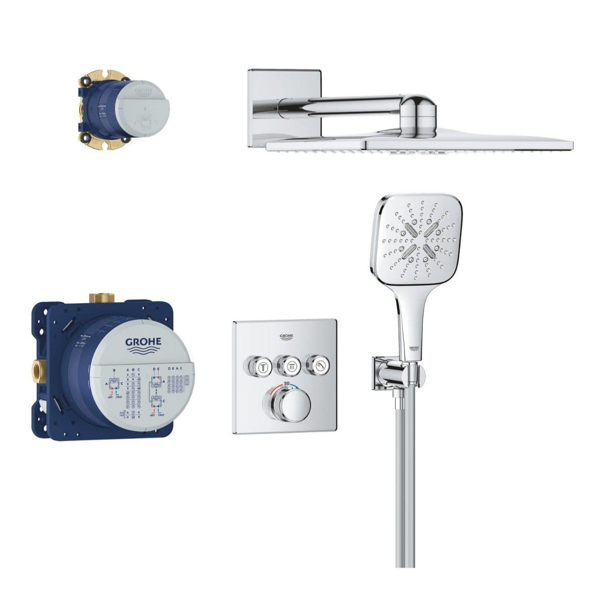 | Фирменные технологии | GROHE DreamSpray® — равномерное распределение воды по форсункам для комфортного потока., GROHE FastFixation — регулировка крепления для быстрого и удобного монтажа., GROHE Jet Spray — мощная круговая струя для массажа, тонуса кожи и ополаскивания., GROHE Long-Life Shine® — износостойкое покрытие, устойчивое к царапинам и загрязнениям., GROHE Massage Spray — пульсирующий режим для расслабляющего массажа., GROHE ProGrip — эргономичные рифлёные ручки для удобного и надёжного захвата., GROHE SafeStop — ограничение температуры до 38 °C для безопасности с возможностью увеличения., GROHE TurboStat® — мгновенная подача и стабильное поддержание температуры воды., Inner WaterGuide — изоляция водных каналов предотвращает нагрев поверхности и защищает покрытие., PureRain Spray — мягкий поток воды, как тёплый дождь., SpeedClean — силиконовые сопла, предотвращающие известковый налёт. |