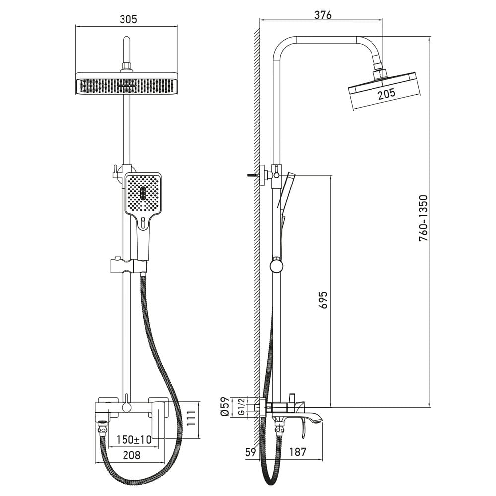 | Длина кронштейна для верхнего душа, мм | 376 |