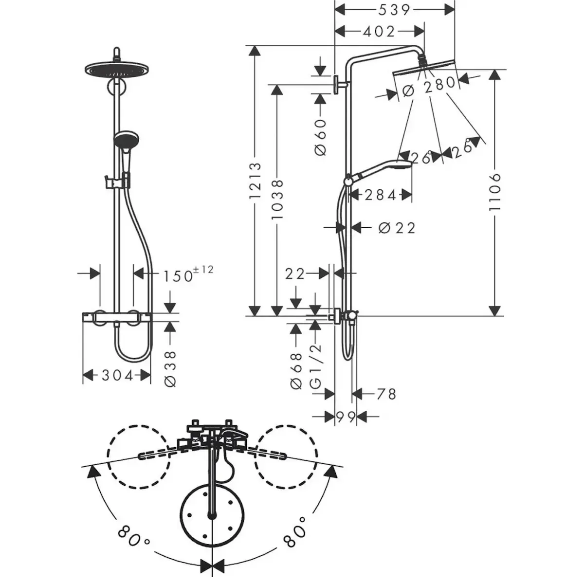 Душевая система Hansgrohe Croma Select S Showerpipe 280 1jet с термостатом, латунь, золотой (26890990)