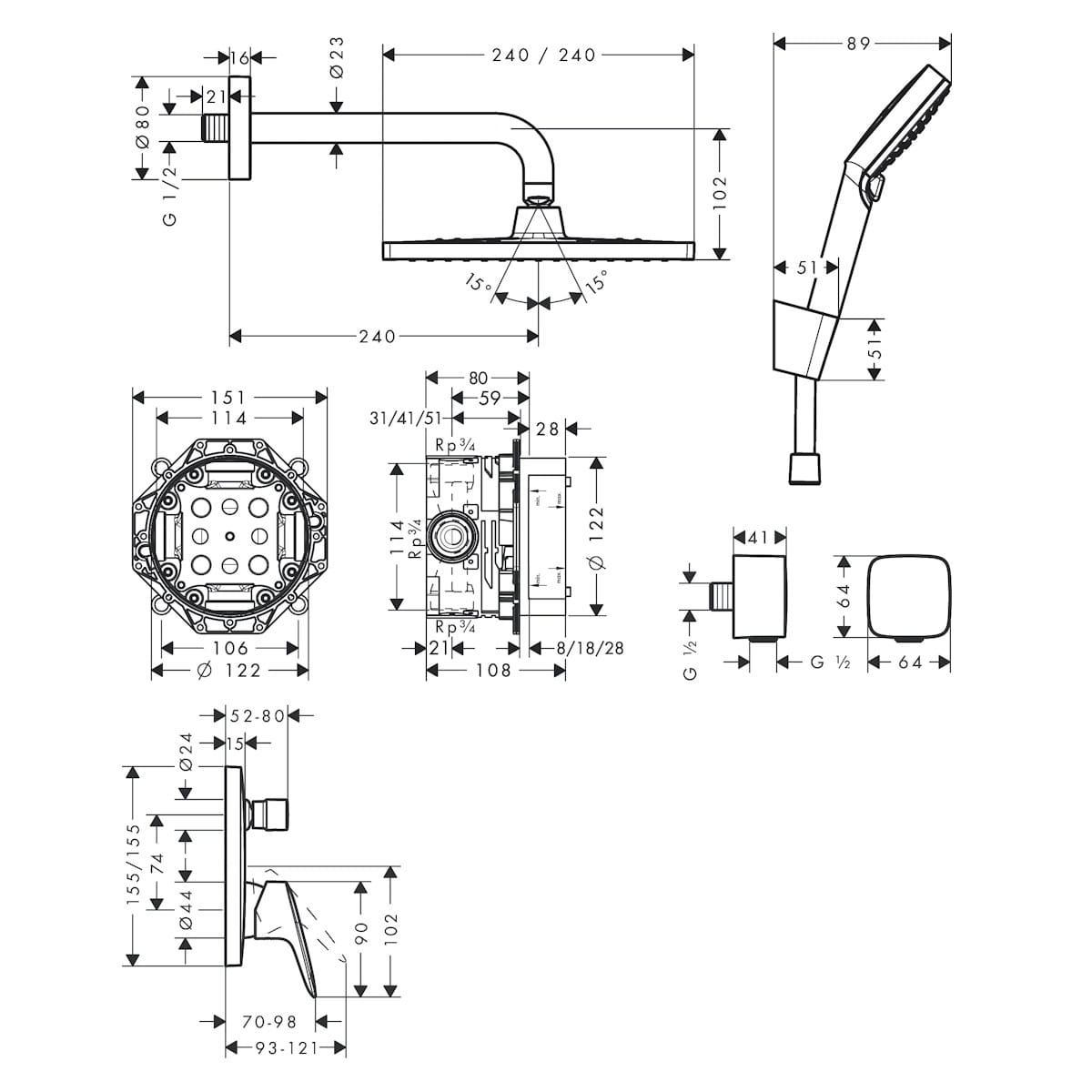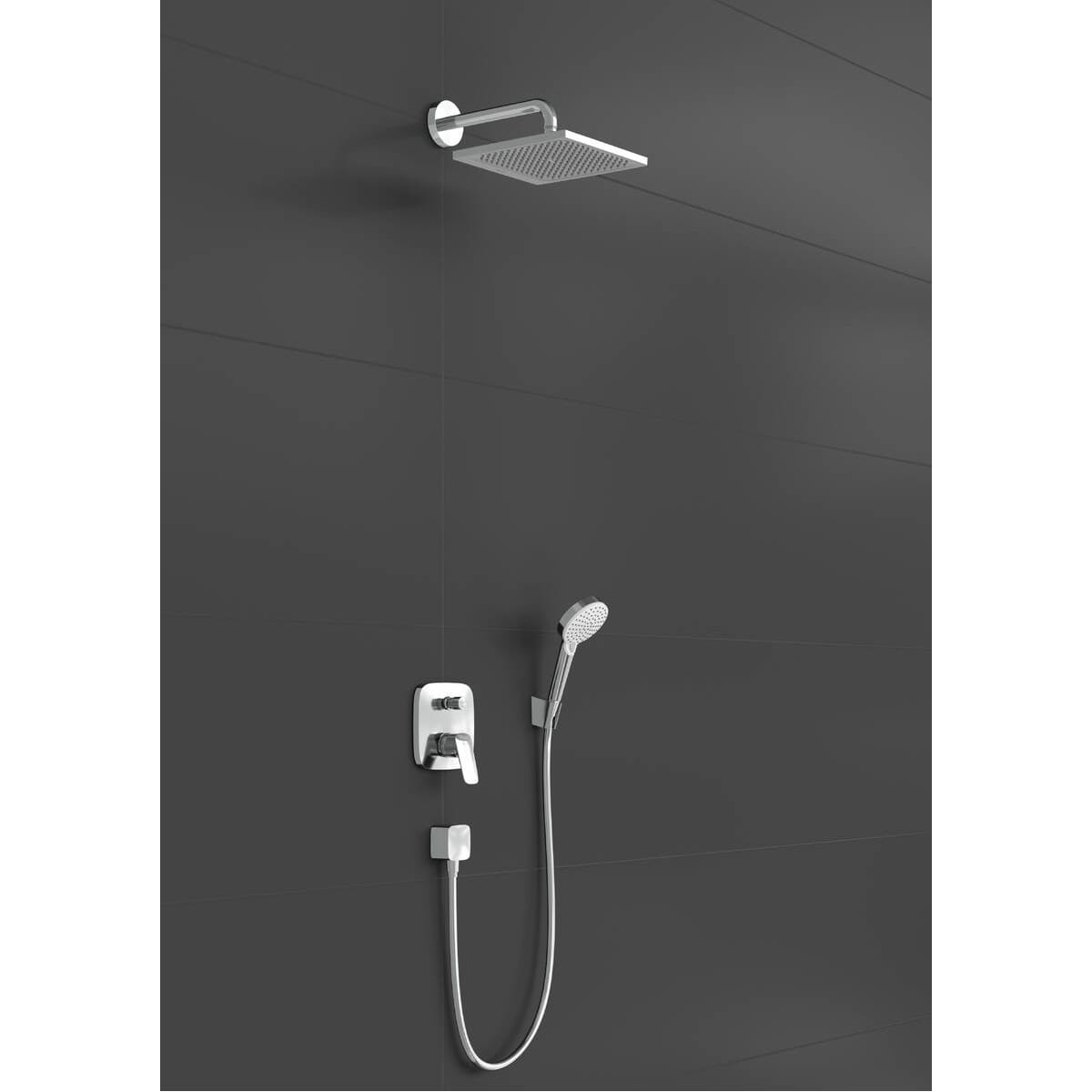 | Комплектация | Верхний душ с кронштейном, Внутренняя часть смесителя, Смеситель скрытого монтажа, Держатель ручной лейки, Душевая лейка, Крепление |