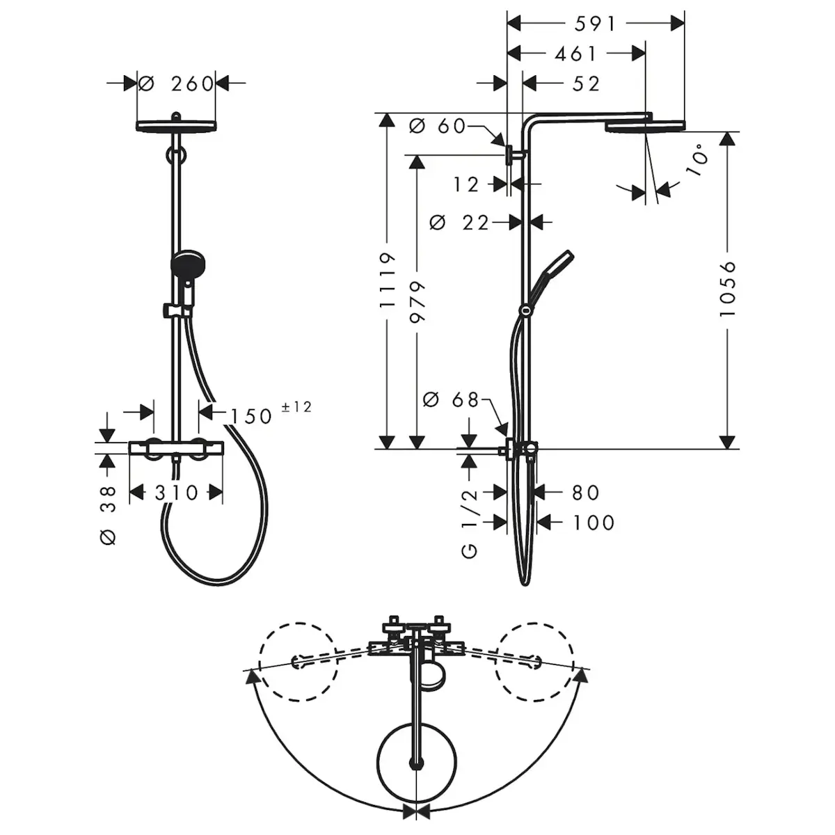 | Комплектация | Верхний душ с кронштейном, Держатель ручной лейки, Душевая лейка, Душевая стойка, Душевой шланг, Крепление, Смеситель термостатический |