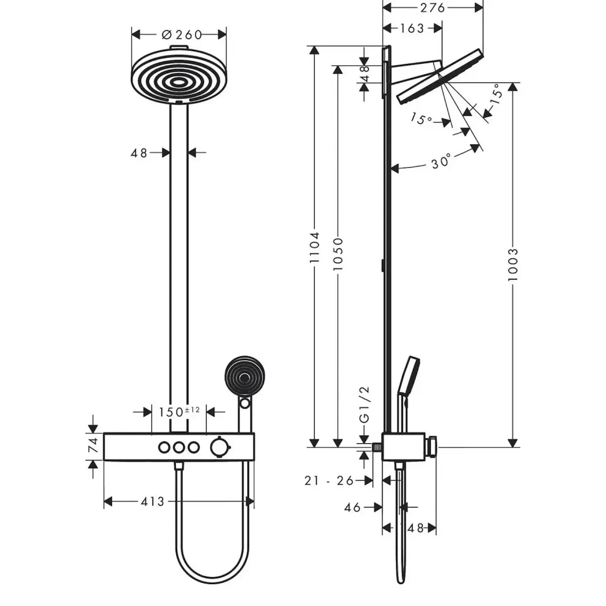 | Комплектация | Верхний душ с кронштейном, Держатель ручной лейки, Душевая лейка, Душевая стойка, Душевой шланг, Крепление, Смеситель термостатический |