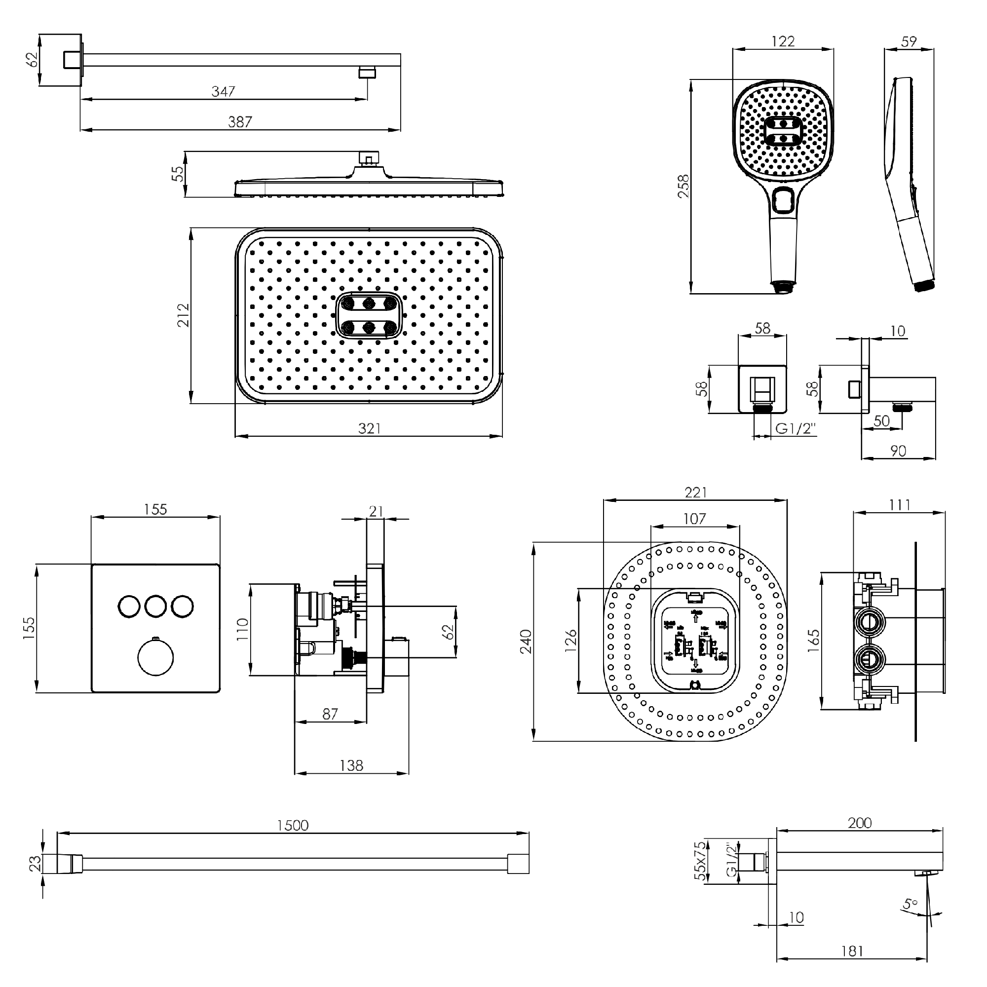 | Комплектация | Смеситель, Скрытая часть смесителя, Верхний душ с кронштейном, Душевой гарнитур, Настенное подключение |
