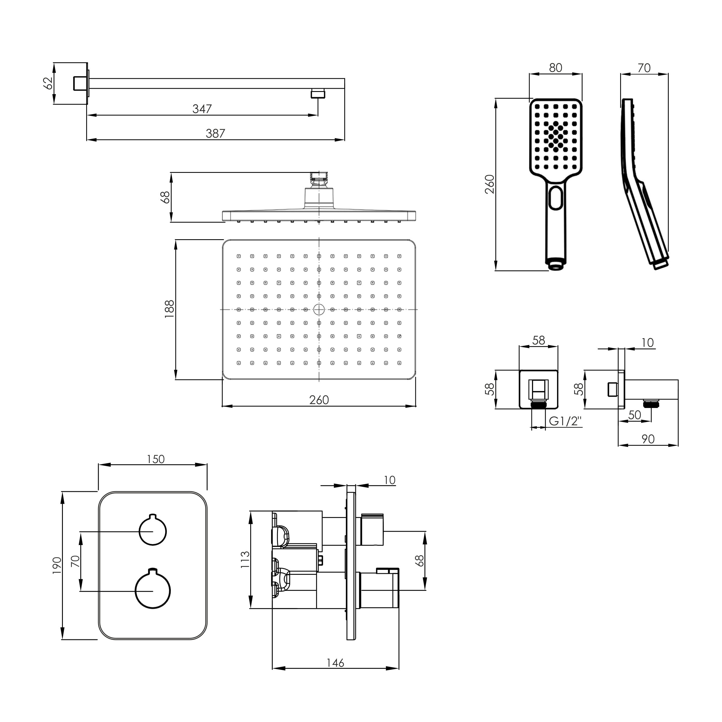 | Комплектация | Смеситель, Скрытая часть смесителя, Верхний душ с кронштейном, Душевой гарнитур, Стеновое подсоединение |