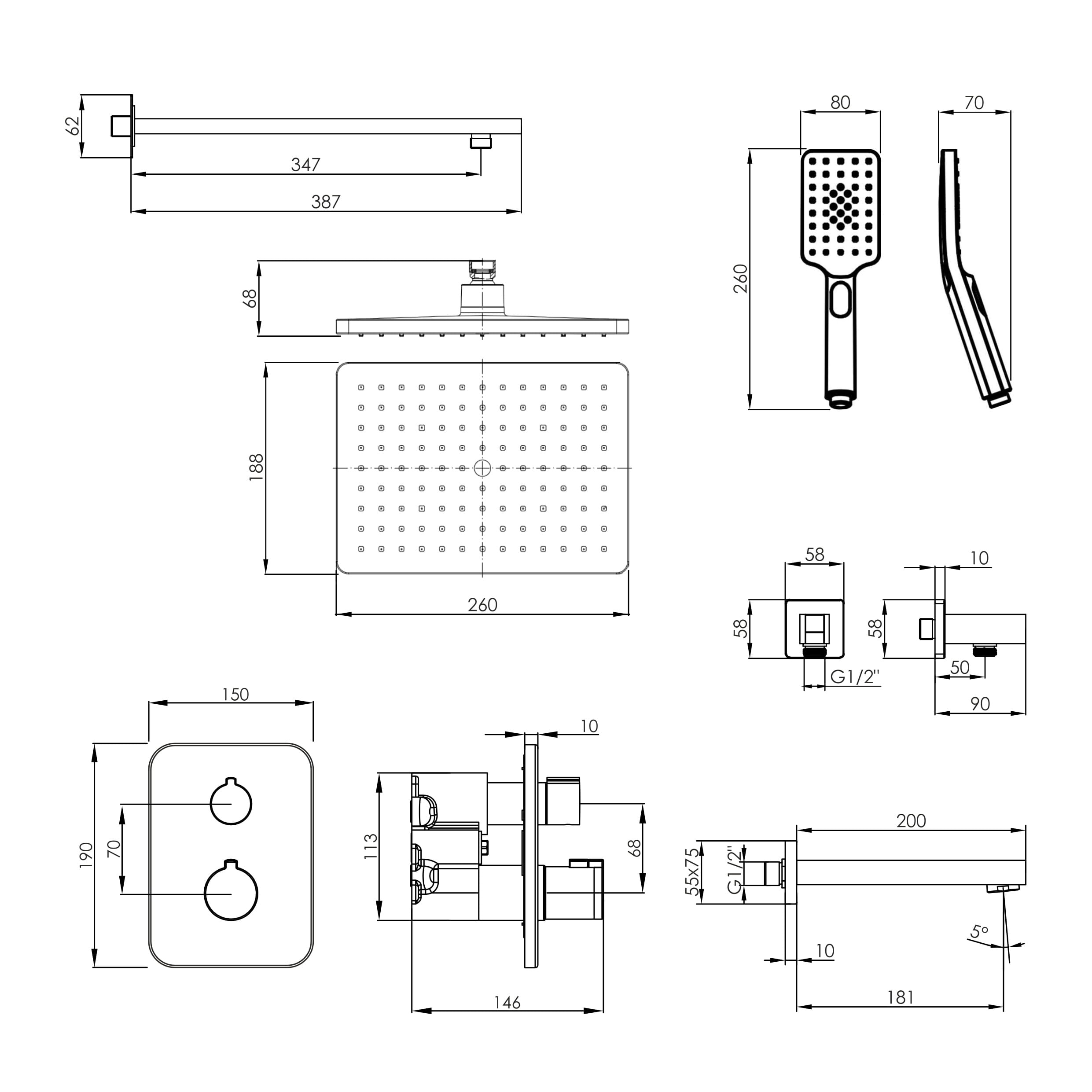| Комплектация | Смеситель, Скрытая часть смесителя, Верхний душ с кронштейном, Душевой гарнитур, Стеновое подсоединение, Излив |