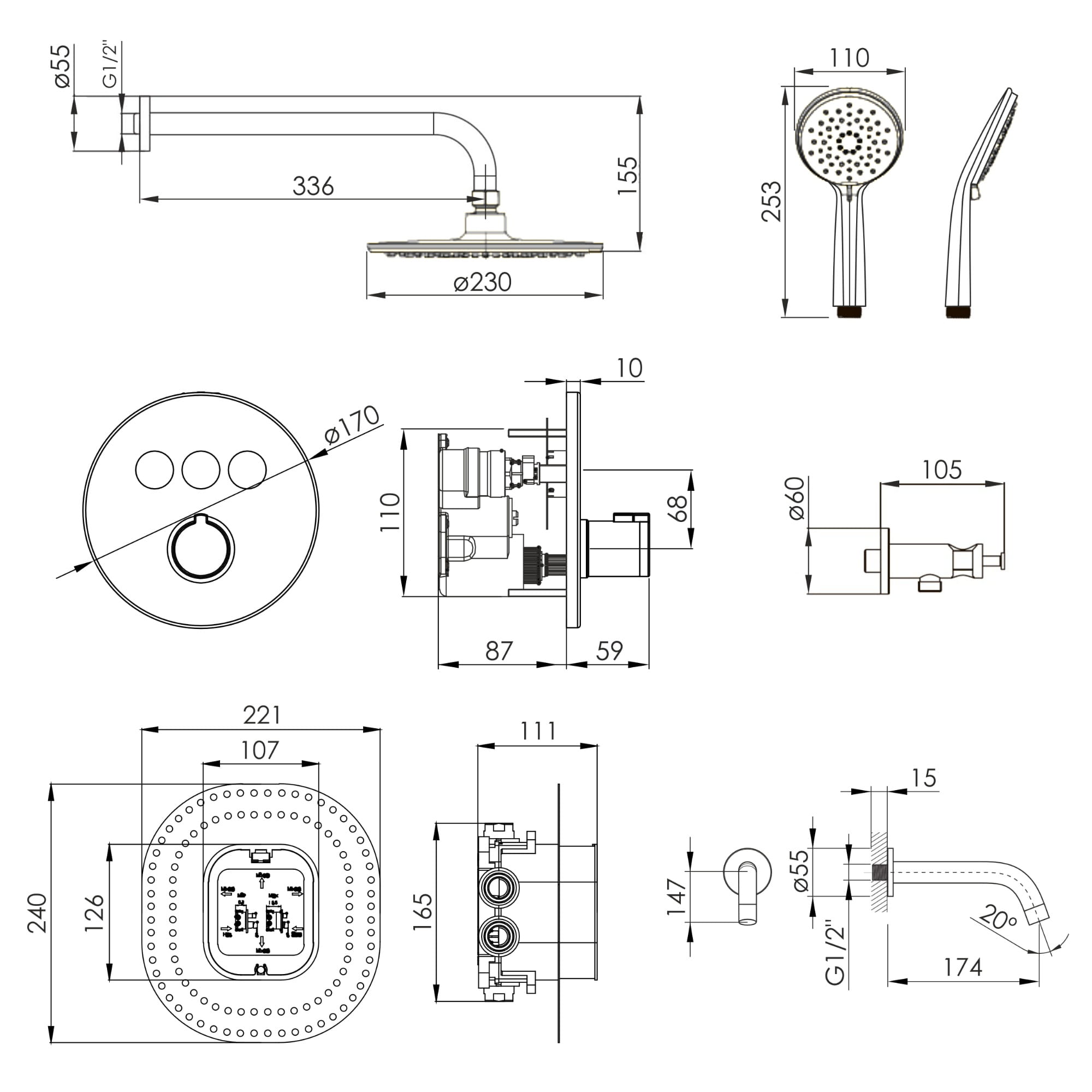 | Комплектация | Смеситель, Скрытая часть смесителя, Верхний душ с кронштейном, Душевой гарнитур, Стеновое подсоединение |