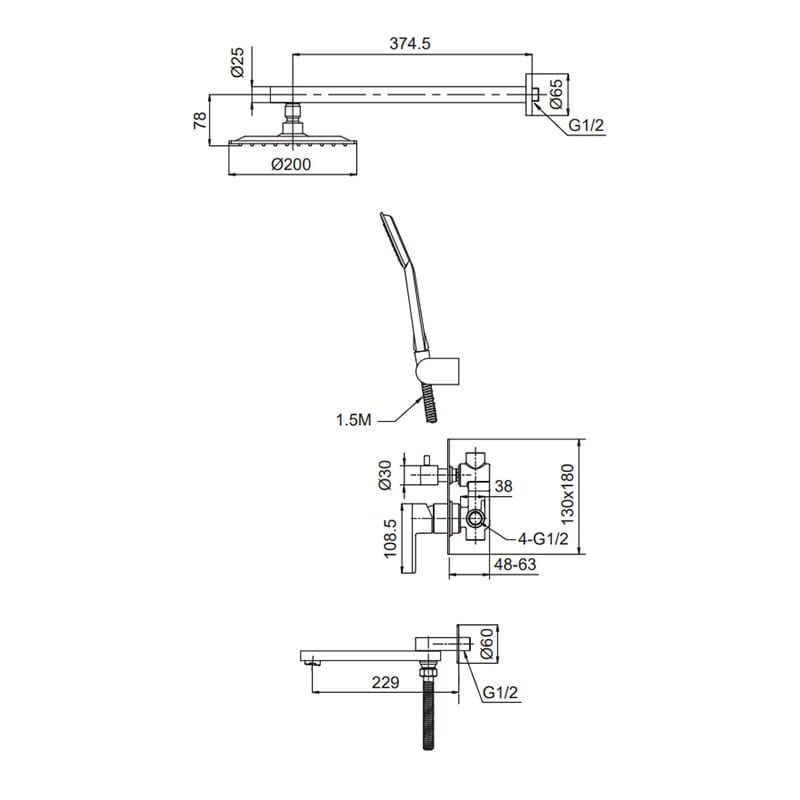 | Длина кронштейна для верхнего душа, мм | 374 |