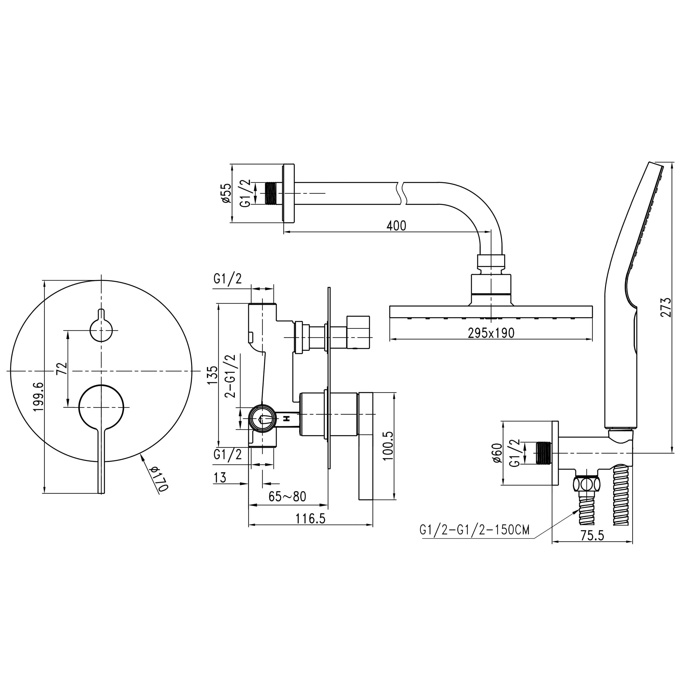 | Диаметр верхнего душа | 295×190 мм |