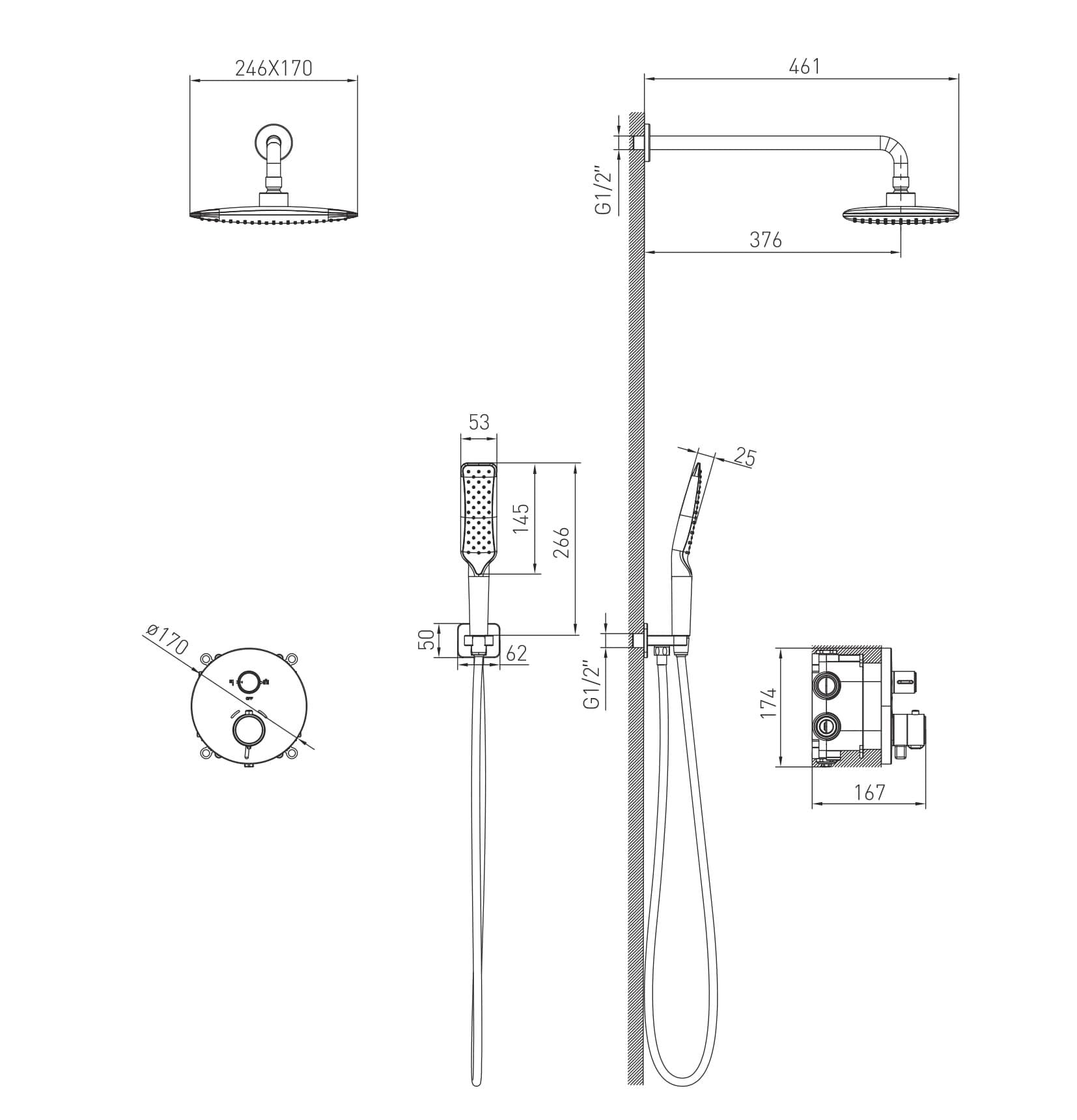 | Комплектация | Смеситель скрытого монтажа, Верхний душ с кронштейном, Душевой гарнитур, Стеновое подсоединение |