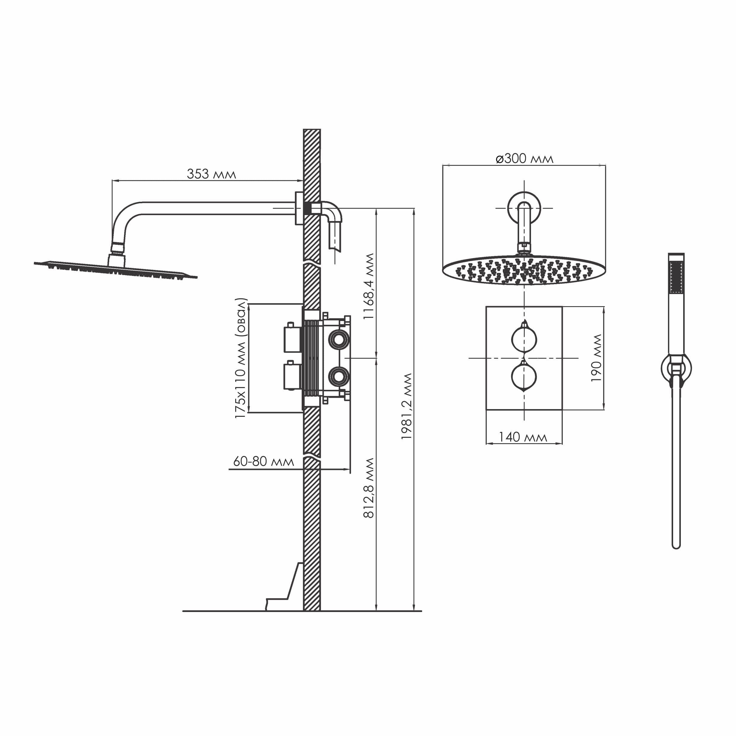 | Комплектация | Смеситель скрытого монтажа, Верхний душ с кронштейном, Душевой гарнитур, Стеновое подсоединение |