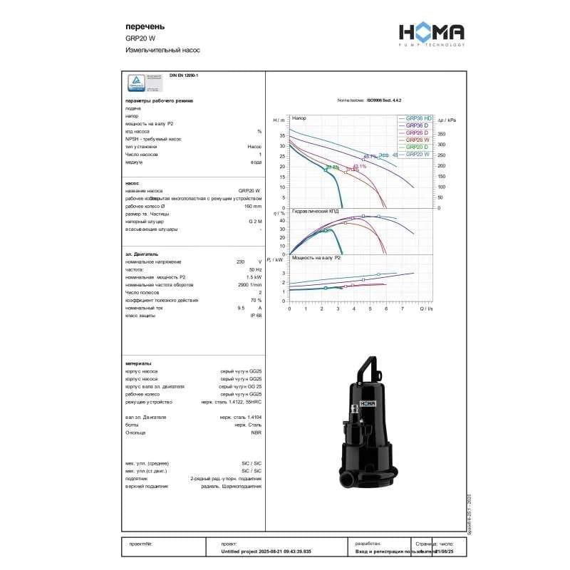 Фекальный насос Homa Barracuda GRP20 W 2,1 кВт H 30 м Q 196 л/мин с измельчителем (9505097.03)