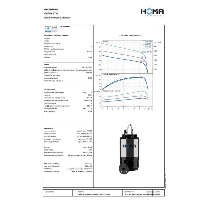 Фекальный насос Homa Barracuda GRP56 ET D 6,4 кВт H 42 м Q 511 л/мин с измельчителем (9504930.01)
