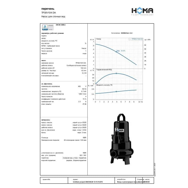 Фекальный насос Homa TP30V10/4 DA 0,7 кВт H 6 м Q 600 л/мин с поплавком (9503256.02)