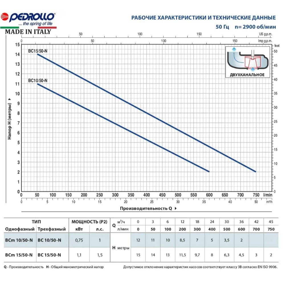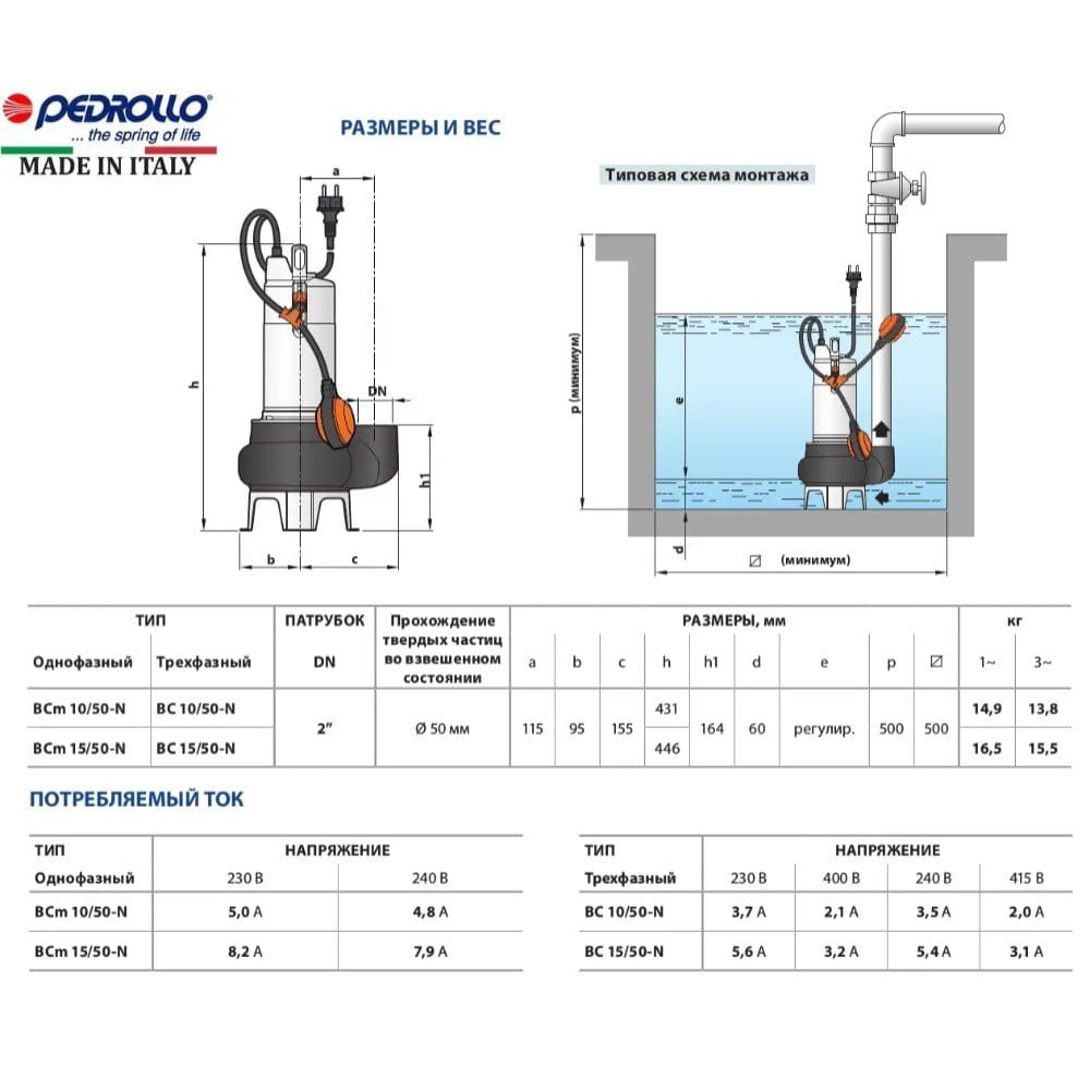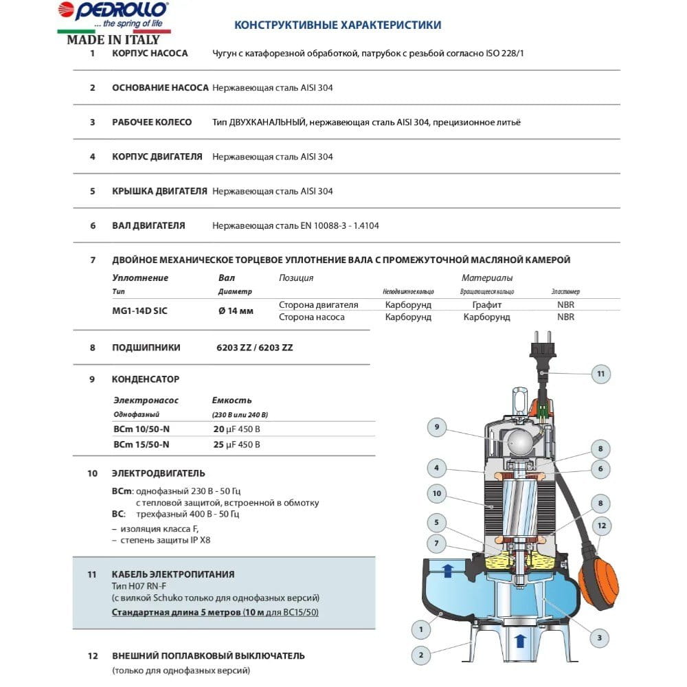 Фекальный насос Pedrollo BCm 10/50-N 0,75 кВт 220 В H 11 м Q 600 л/мин с поплавком (48SGM81A0A1)