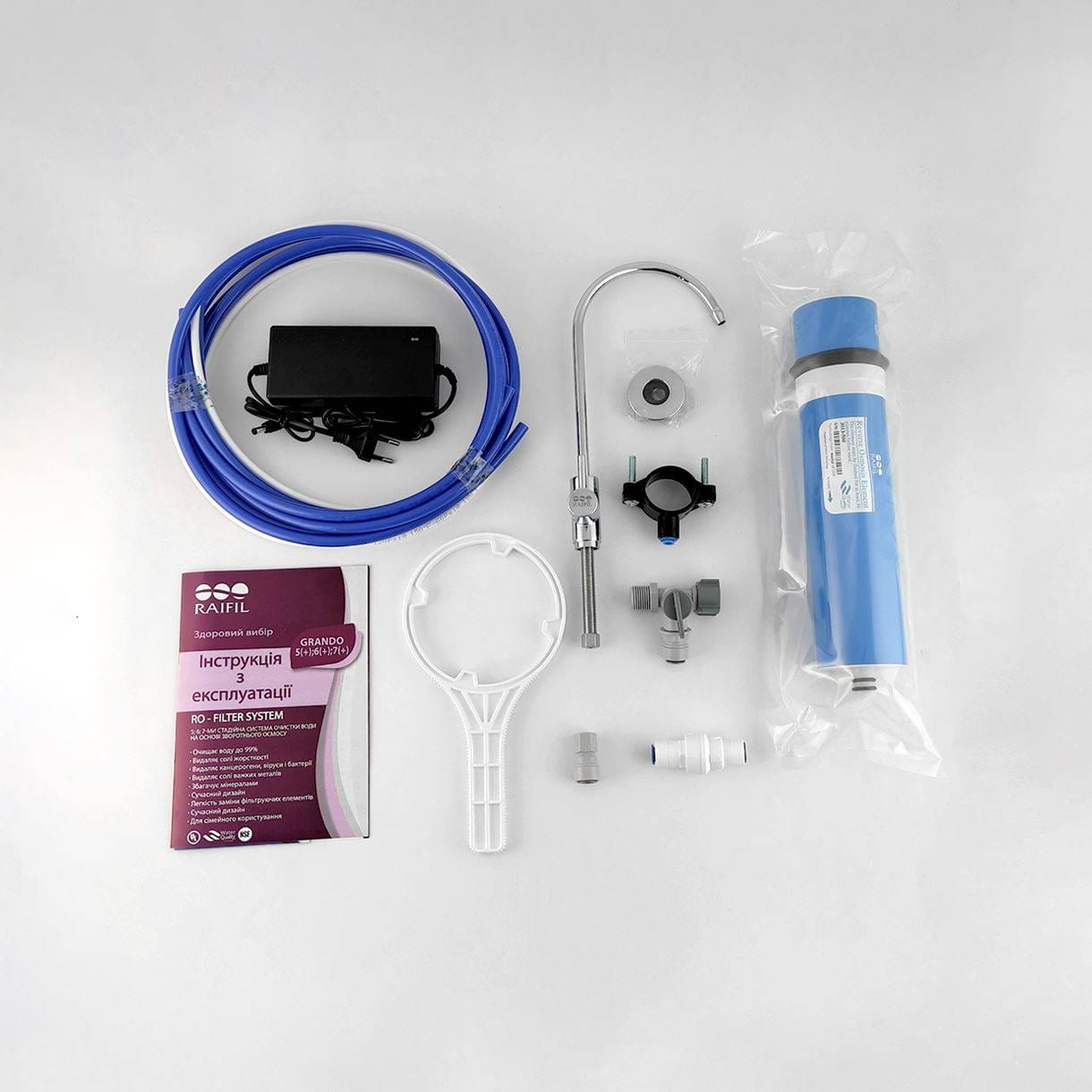 | Комплектация | Фильтр обратного осмоса, Редуктор давления, Ключ для колб, Дренажный хомут, Комплект трубок для подключения, Кран, Стальная рама |