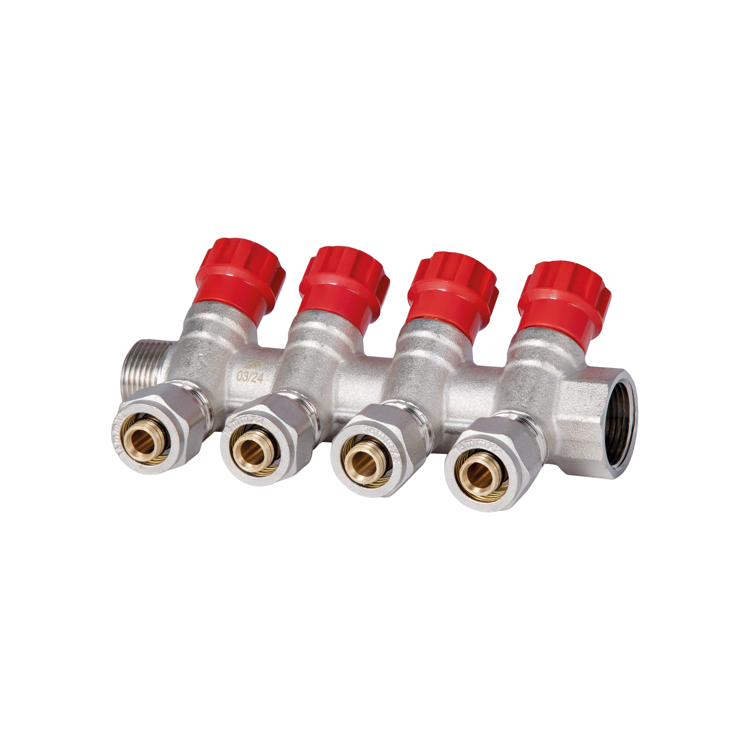 Коллектор SD Plus 3/4" 4 выхода SD230W4 обеспечивает подключение труб и осуществляет гидравлическое распределение воды. Изготавливается из латуни с никелированным покрытием. Изделие может поставляться как с синими, так и с красными регулировочными ручками.