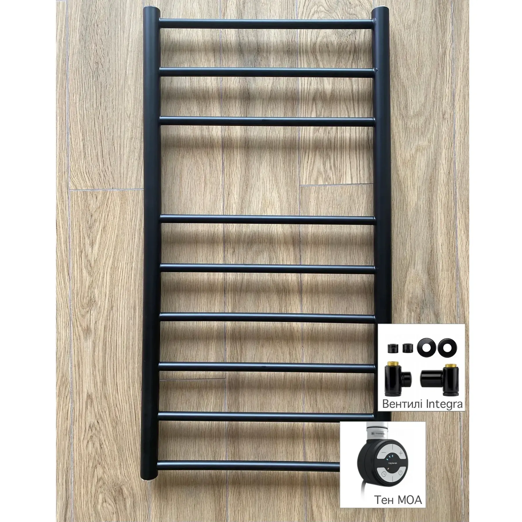 | Комплектация | Вентиль ручной Integra, Кабель спиральный с вилкой, Комплект креплений, Маскирующая розетка, Полотенцесушитель, ТЭН MOA, Удлинитель с резьбой (2 шт.) |