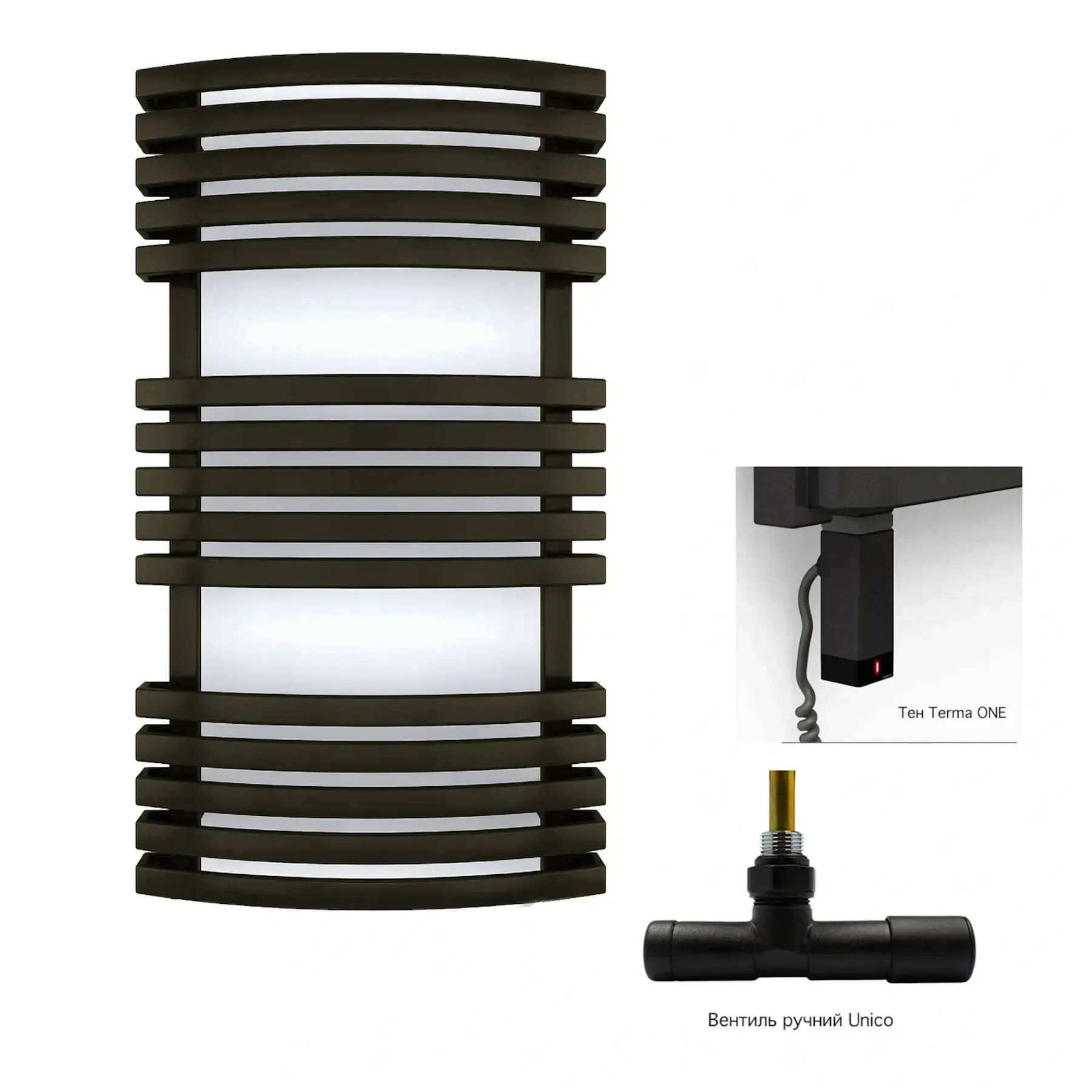 | Комплектация | Вентиль Unico, Кабель спиральный с вилкой, Комплект креплений, Маскирующая розетка, Полотенцесушитель, ТЭН ONE |
