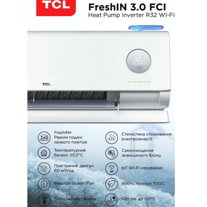 Кондиционер TCL FreshIN 3.0 FCI Heat Pump 25м2 (-30°С) R32 инверторный, белый + пульт ДУ (Wi-Fi) (TAC-09CHSD/FCI)