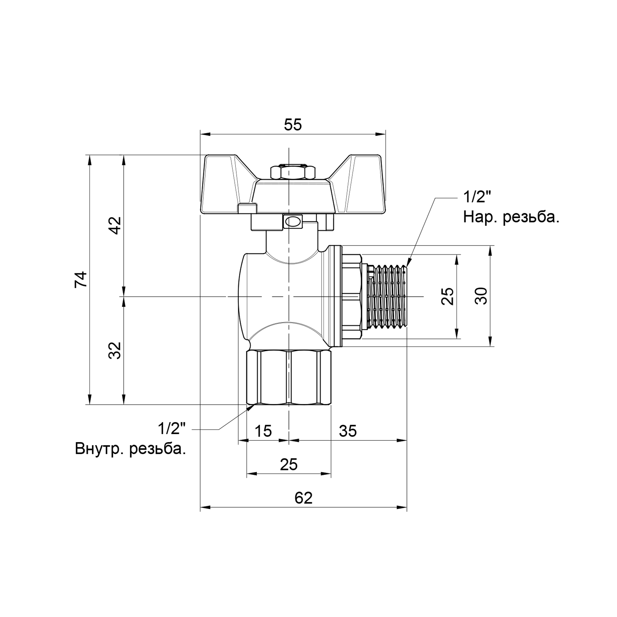 Кран шаровой SD Forte 1/2" ВН для воды угловой (бабочка) — элемент запорно-регулирующей арматуры. Изготавливается из латуни с никелированным покрытием.