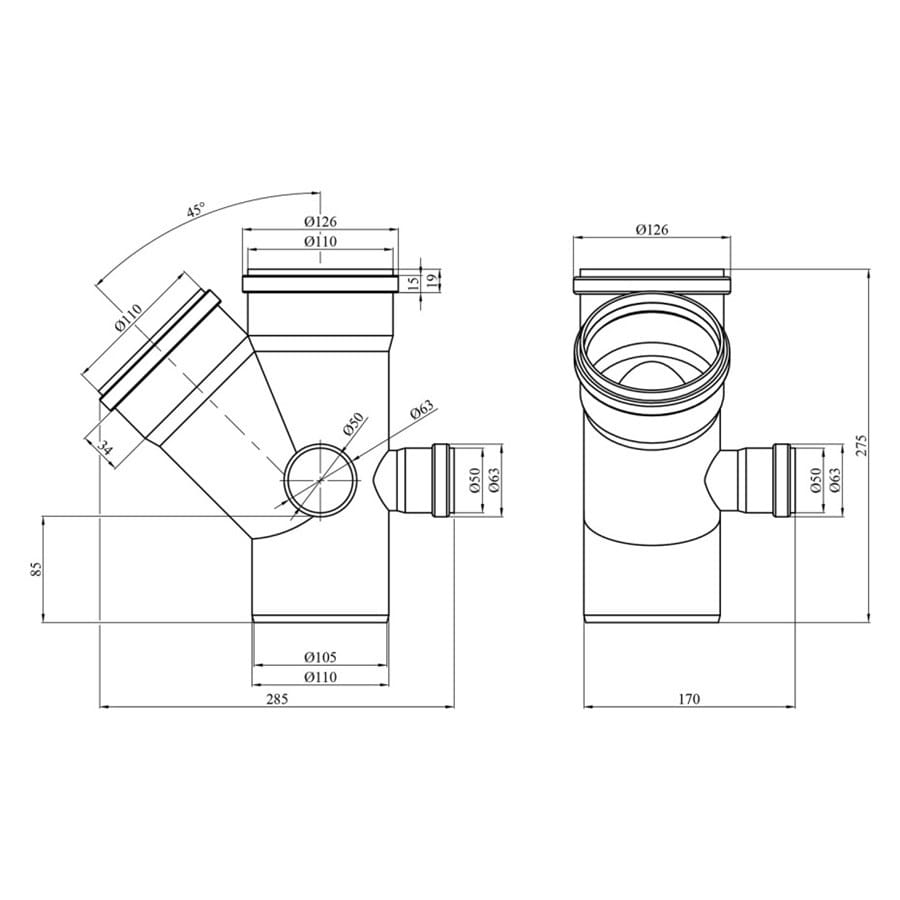Крестовина внутренней канализации Rozma 110×50мм 45°/90° двухплоскостная (CV030233)