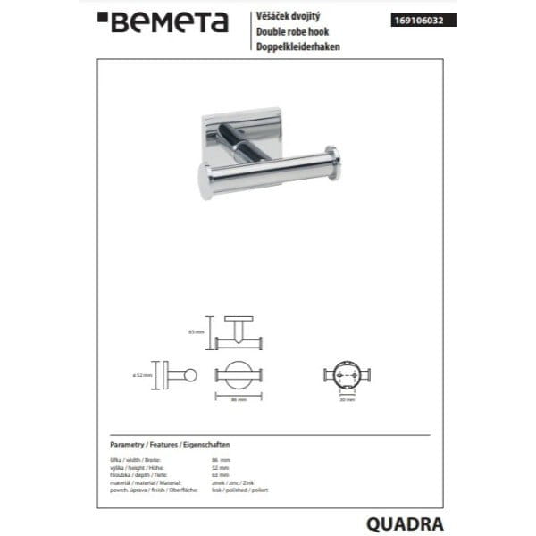 Крючок для полотенец Bemeta Quadra металл, хром (169106032)