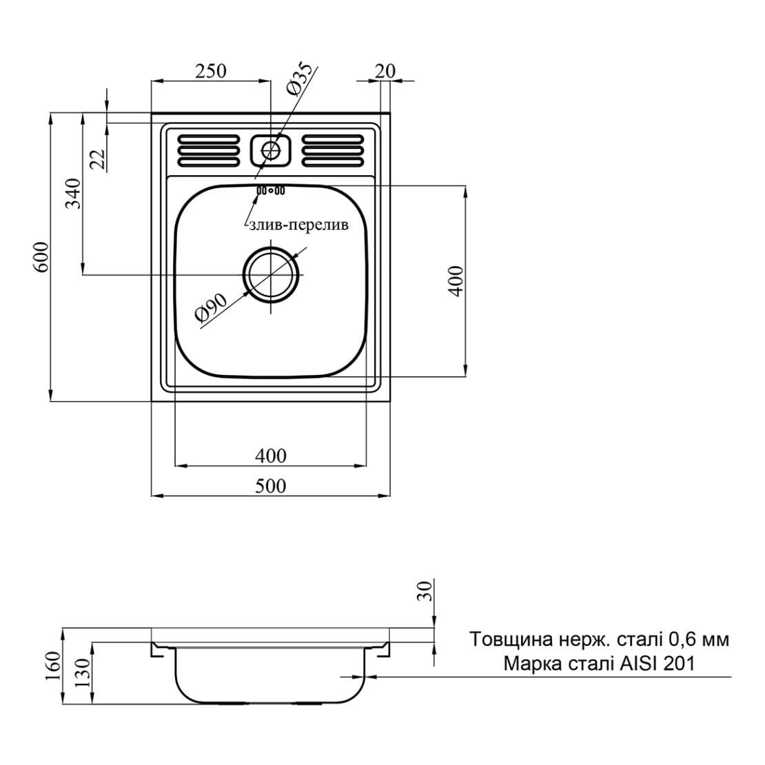 Кухонная мойка Kroner KRP Satin 500×600 накладная, прямоугольная, сталь (0,6 мм)