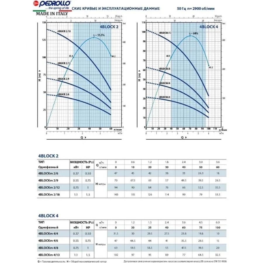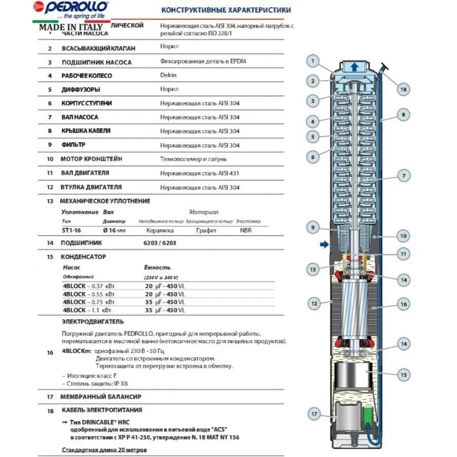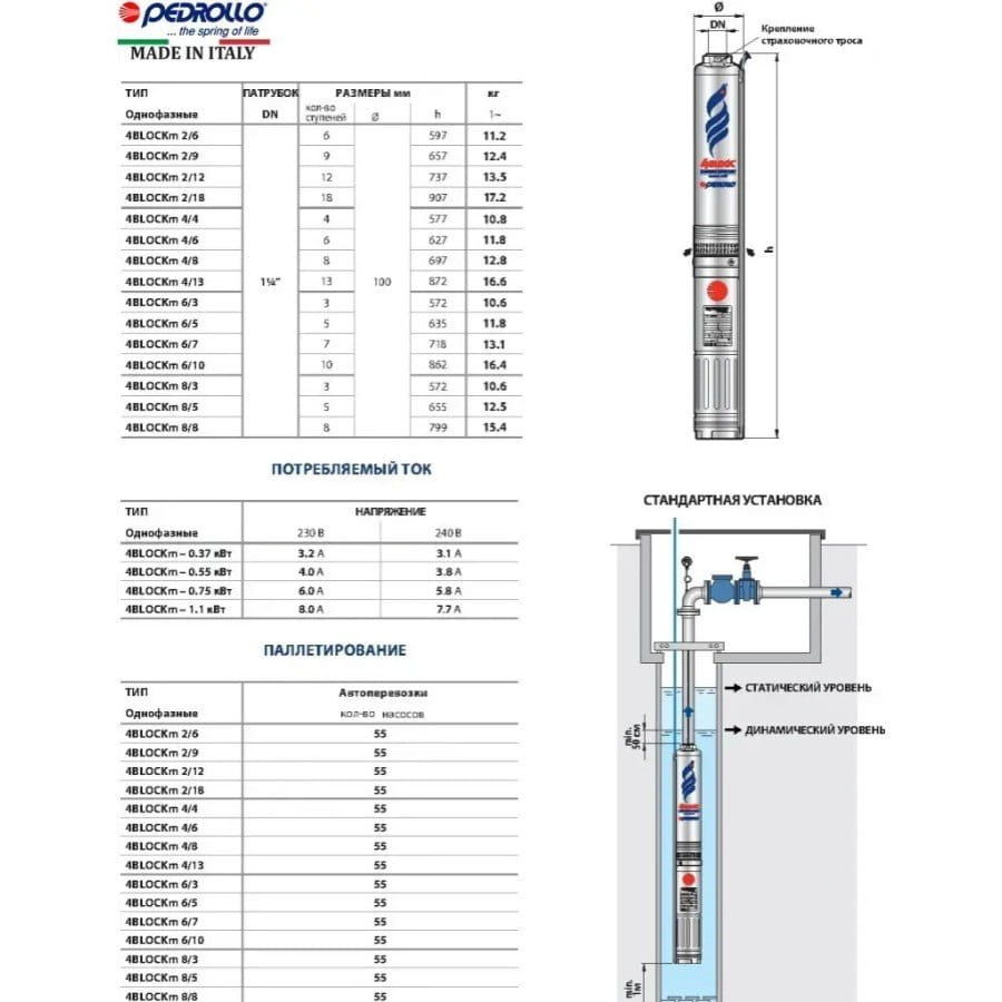 Насос глубинный Pedrollo 4BLOCKm/10 0,75 кВт H 85 м Q 60 л/мин центробежный (49M41210LA1)