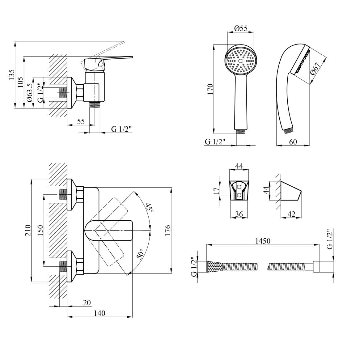 | Комплектация | Крепление, Лейка для ручного душа, Держатель ручной лейки, Душевой шланг, Инструкция, Смеситель |
