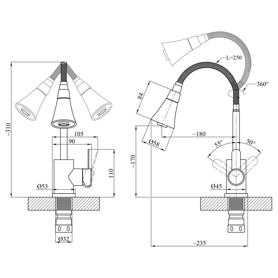 | Тип излива | U-образный, Поворотный, Рефлекторный (Гибкий), Высокий |