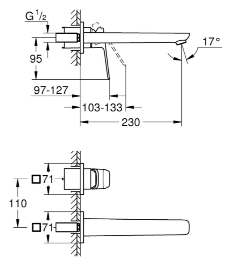 | Комплектация | Смеситель, Комплект верхней монтажной части 23 200, Металлическая розетка, Металлический рычаг, Крепление |