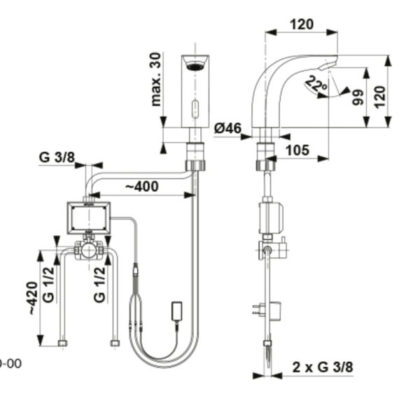 Комплектация | Блок питания трансформатор 230 В, Гарантийный талон, Инструкция по монтажу, Керамический регулятор, Ключ аэратора, Смеситель, Шланги подключения, Электромагнитный клапан с регулятором |