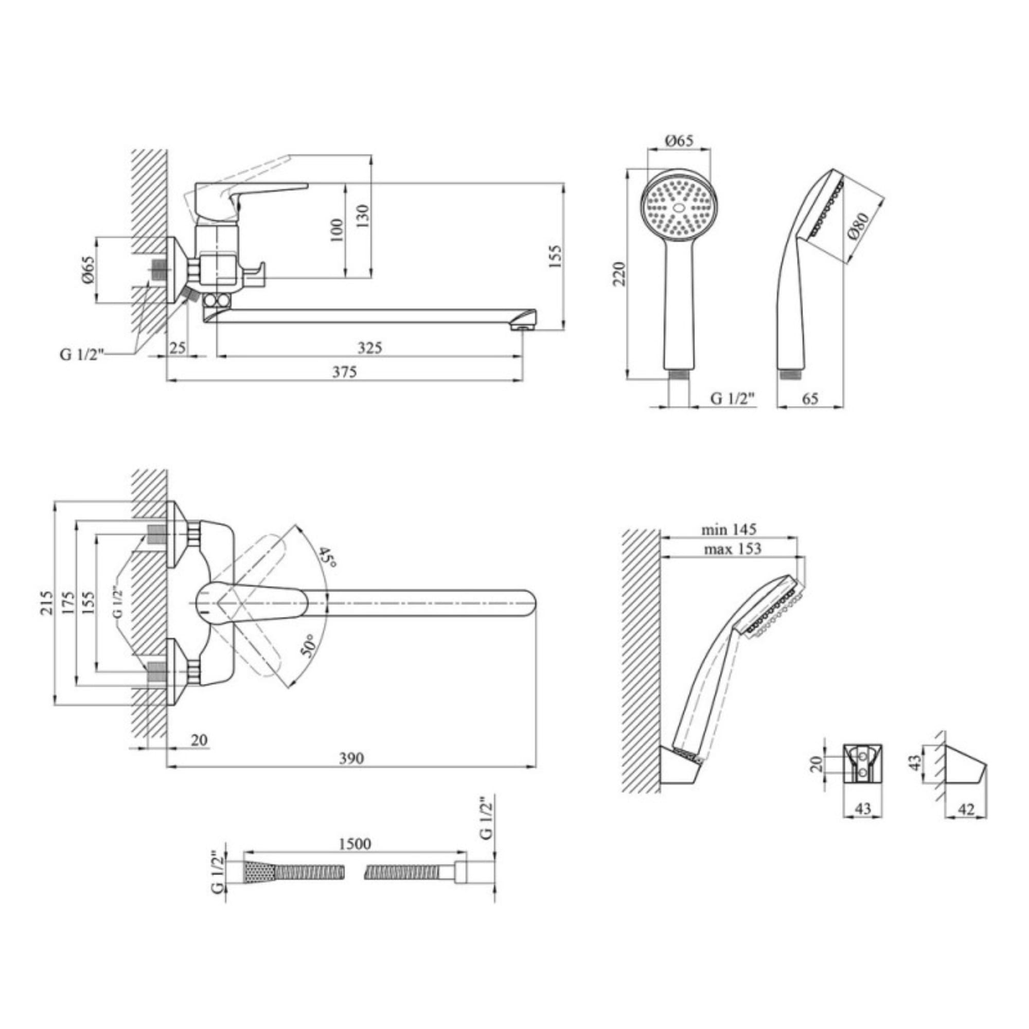 | Комплектация | Смеситель, Лейка для ручного душа, Душевой шланг, Кронштейн для ручного душа, Крепление, Инструкция |