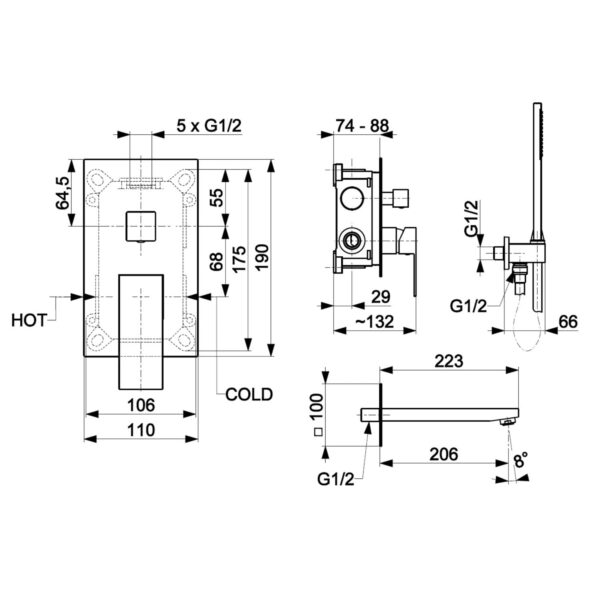 Комплектация | Смеситель скрытого монтажа, Держатель для ручного душа, Душевой шланг, Ручная лейка |