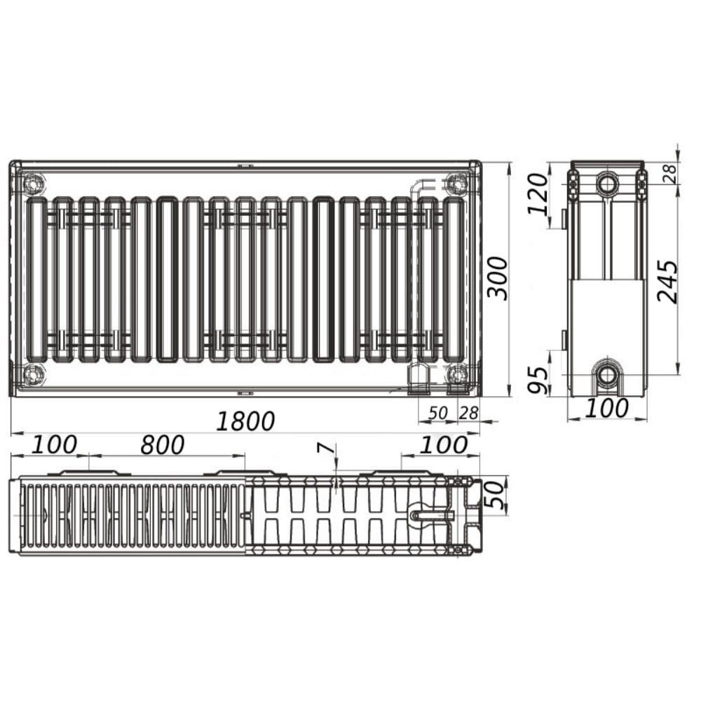 Стальной радиатор KALITE 300×1800 тип 22, нижнее подключение, белый (без клапана OUTER)