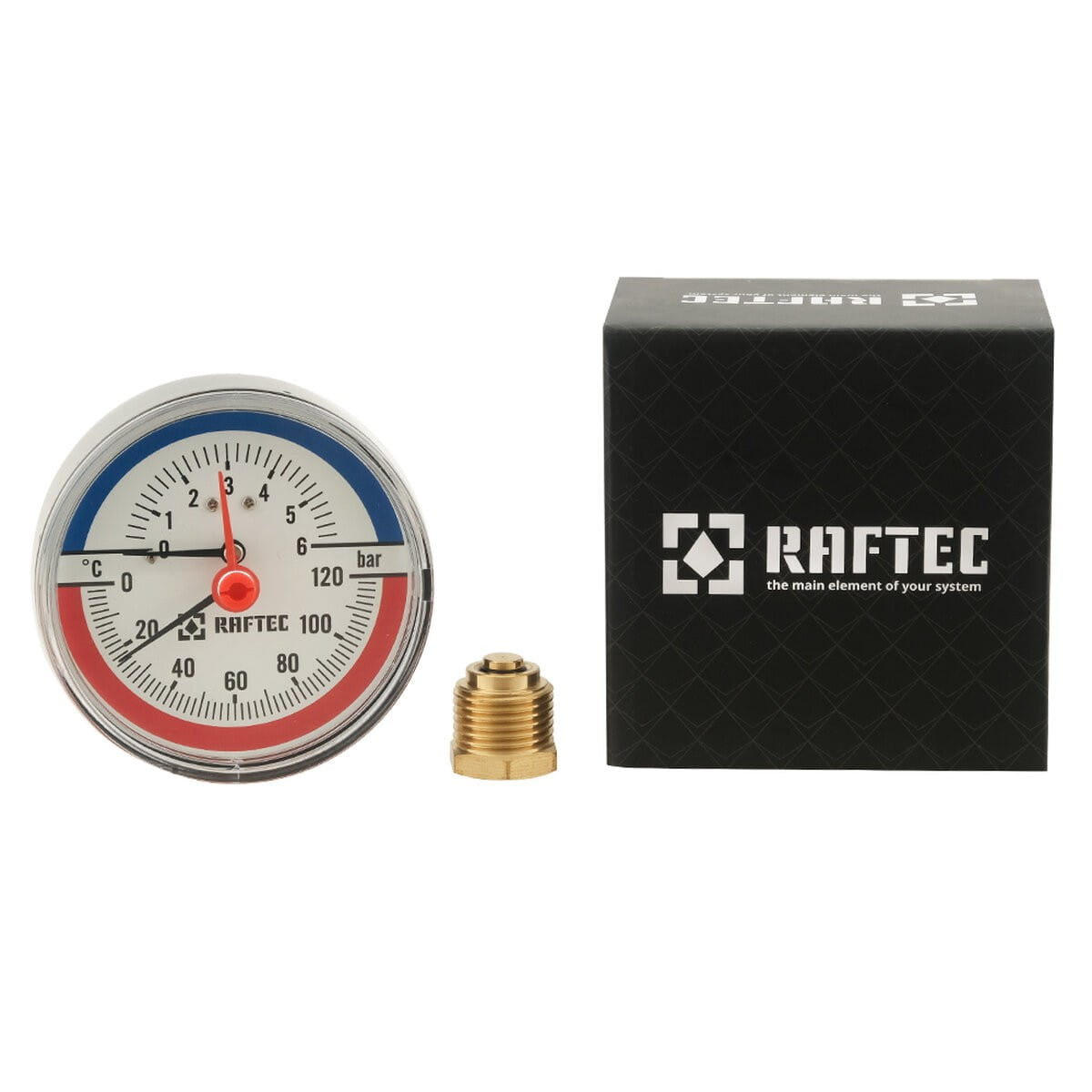 Термоманометр аксиальный Raftec биметаллический 1/2″ 6 бар 120°C