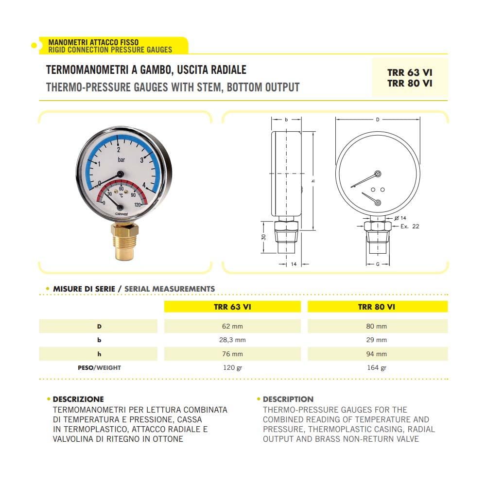 Термоманометр радиальный Cewal TRR 80 биметаллический 1/2″ 6 бар 120°C (91568600)
