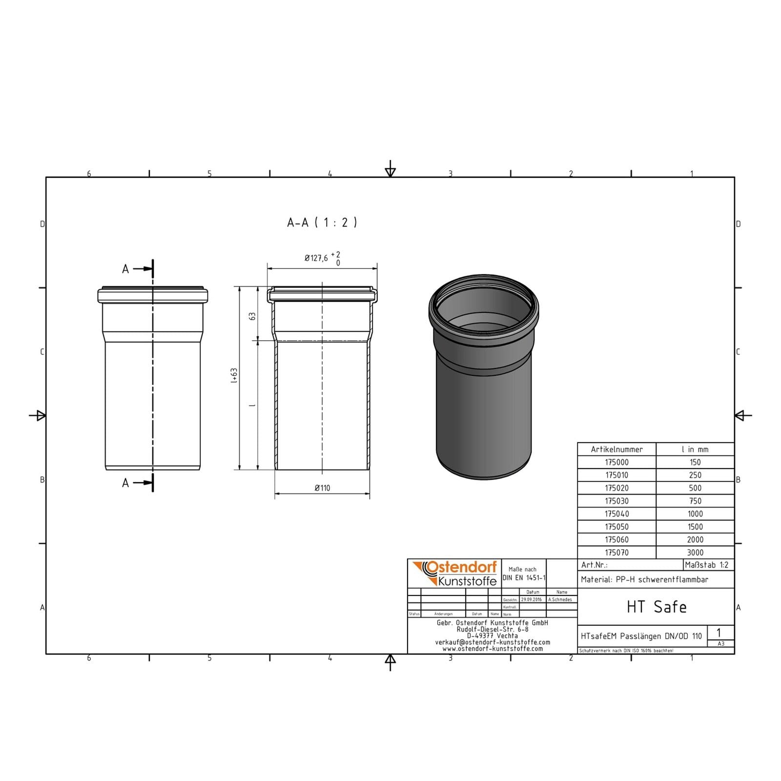 Труба канализационная Ostendorf HT Safe 110×500мм внутренняя (175020-05)