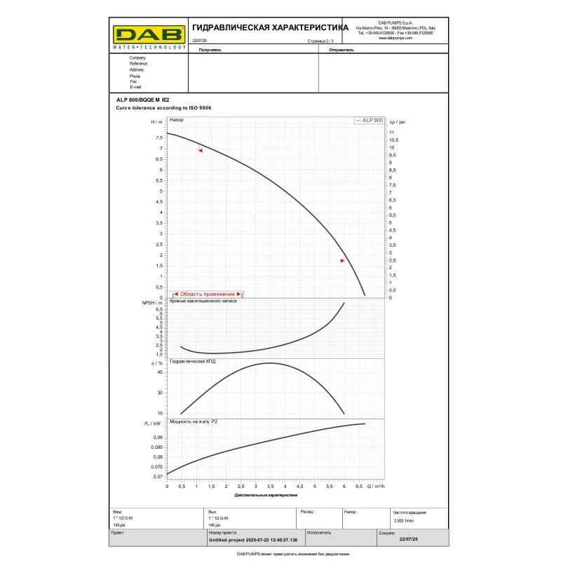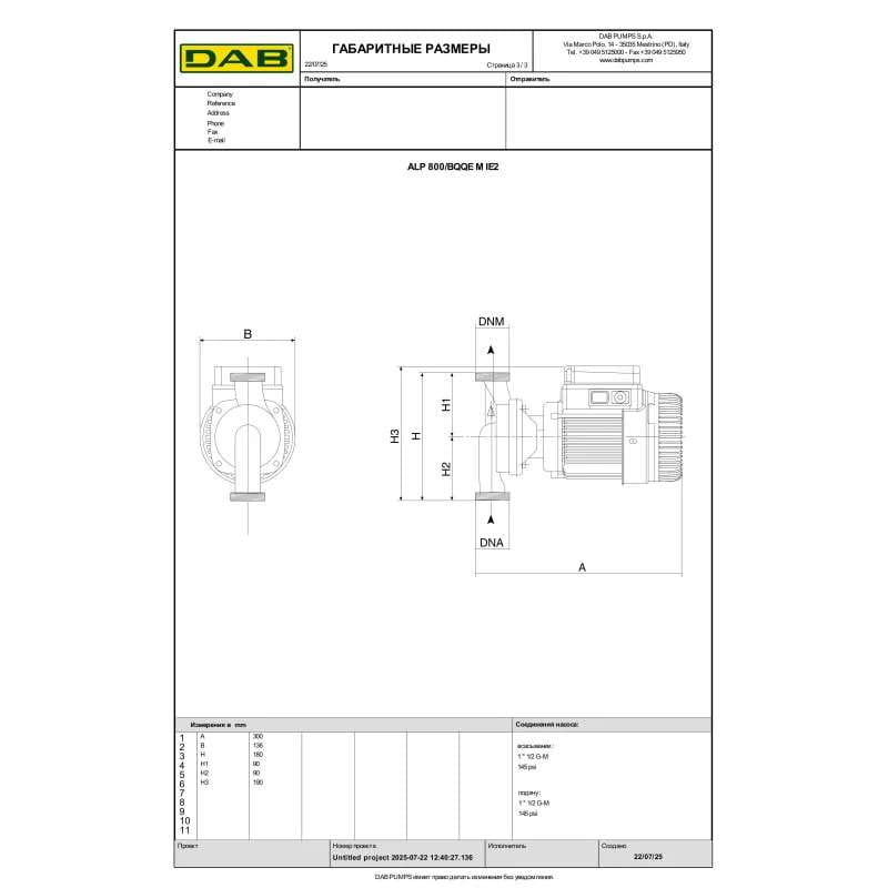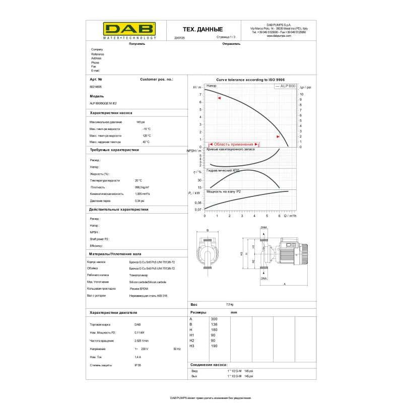 Циркуляционный насос ин-лайн DAB ALP 800 M 110 Вт H 8 м Q 145 л/мин механический (602146120)
