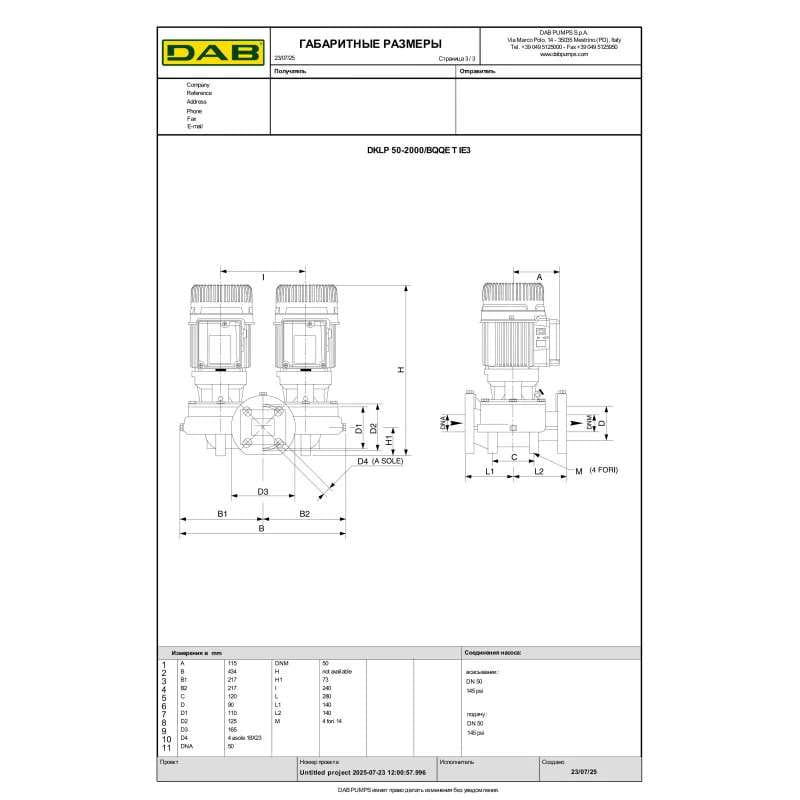 Циркуляционный насос ин-лайн DAB DKLP 50-2000/BQQE T 1830 Вт H 32 м Q 661 л/мин механический (60214780)