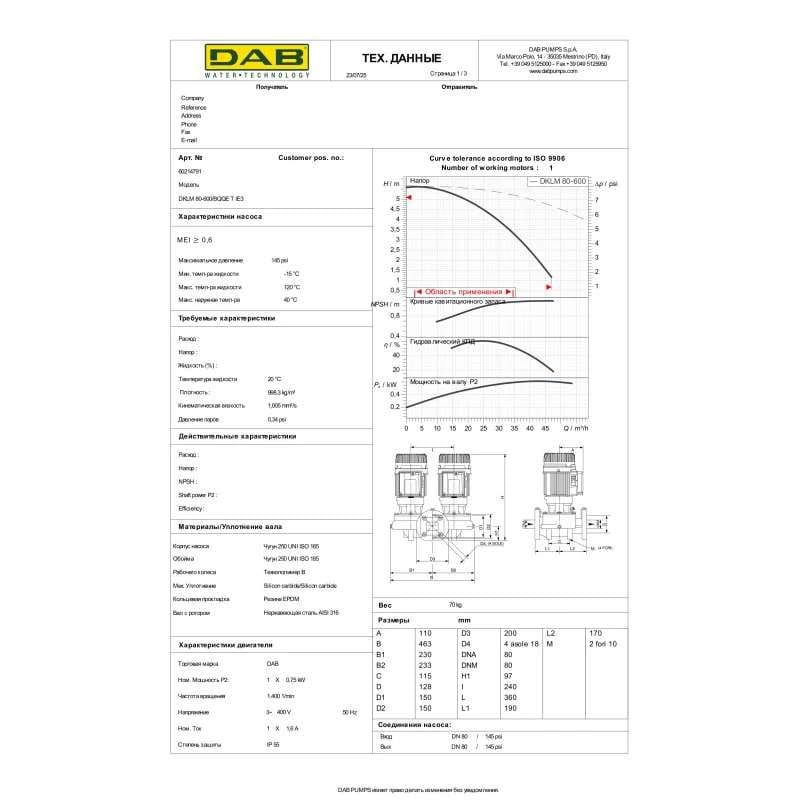 Циркуляционный насос ин-лайн DAB DKLP 80-600/BQQE T 750 Вт H 6 м Q 785 л/мин механический (60214791)